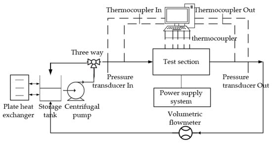 Figure 4 presents the experimental system, which simulates the operation of the channel heat sink. The deionized water is stored in the water tank as coolant and flows into the test section after regulating the flow through the pressure pump and valve. A vortex meter was used for flow measurement, and a four-wire platinum resistance temperature sensor (RTDS) was used to measure the inlet and outlet temperature of the test section; a differential pressure transducer was also installed at the inlet and outlet of the test section to permit accurate measurement of friction pressure drop during testing. The outdoor heat exchanger ensured the constant water temperature during the experiment. The water and surface were degassed prior to taking measurements. At each mass flux, when the temperature fluctuation of the thermocouple within 1 min is less than 1 °C, the heat transfer of the system could be considered to reach a steady state, with data collected through an Agilent 34,972 A Multifunction measurement unit.