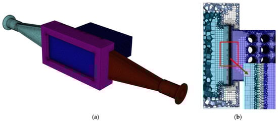Mesh used in the numerical simulations: (a) integrate grid for experimental equipment; (b) local fluid grid.