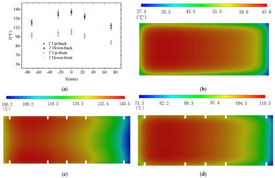 Temperature distribution: (a) average temperature of measuring points and heat transfer wall temperature under different flow rates; (b) temperature distribution of heat transfer surface; (c) temperature distribution of heater section in back row thermometer position; (d) temperature distribution of heater section in front row thermometer position.