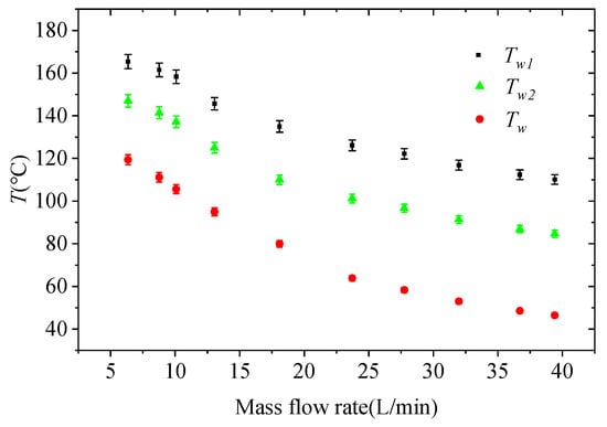 The governing Equations (15)–(20) were solved for turbulent flow at the corresponding boundary conditions. The values of temperature from four groups of thermocouples along the flow direction are shown in Figure 7a; the heat flux is 0.9 MW/m2, and Re is 15,000. Figure 7b–d is the numerical simulation results under this condition. The error bars are standard deviations of the repeated results of each thermocouple taken every five minutes in an hour at a steady state. It is shown that there is little difference between symmetrical measuring points along height direction, indicating the reliability of the measurement results and the uniformity of heat distribution along the height. The temperature distribution shows a trend of high in the middle and low at both ends, which is related to the heat conduction at both ends of the flow inlet and the experimental body. The relationship between the average wall temperature and the flow rate obtained from the original data of the experimental measurement points and the formula is shown in Figure 8. The increase of the flow rate leads to the enhancement of the heat transfer capacity. The temperature of the heat exchange surface is close to the saturation temperature (120 °C) at the inlet mass flow rate of 6 Kg/min.