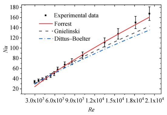 Heat transfer correlation with experimental data under constant Re.