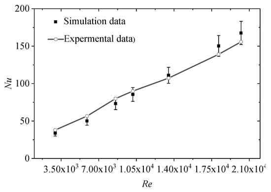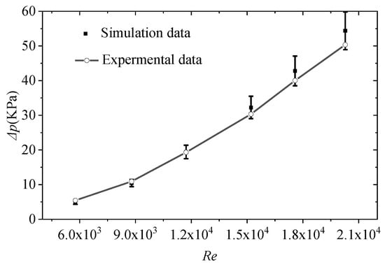 The experimental flow and heat transfer process was simulated by the CFD method. Figure 11 and Figure 12 show a comparison of the simulation results with the experimental results. The maximum deviation of Nu and pressure drop are 8.2% and 11%, respectively, which indicates that the simulation results are in good agreement with the experimental data, demonstrating the feasibility of the numerical simulation approach. Furthermore, it is shown that the heat transfer effect is enhanced with the increase of Re. When the Re exceeds 6000, the turbulence develops into a complete turbulent state, which intensifies the flow heat transfer, thus leading to an increase in the proportion of the heat transfer coefficient.