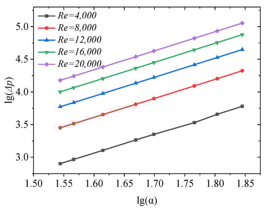 In the target design process, the channel thickness will affect the solid volume fraction of the target and ultimately affect the neutron production efficiency of the target. Therefore, it is necessary to explore the influence of width-to-height ratio on flow and heat transfer under the condition of height determination. From Equation (27), it is evident that in the heat transfer process of small channels, the heat transfer coefficient changes with Re and Pr, and the structural change has no effect on Nu. However, for the flow resistance, different structures will affect the flow resistance coefficient. In this study, the relationship between aspect ratio and pressure drop is studied by numerical method, and the simulation conditions are the same as Section 3.2. From Figure 13, it can be inferred that the logarithm of pressure drop shows a linear relationship with the logarithm of aspect ratio when the channel length is 170 mm and the height is 70 mm, and the pressure drop increases with the increase of aspect ratio and Re. The classical least squares method was used to evaluate the regression analysis coefficient. The relationship between the height–width ratio and pressure drop is defined in Equation (29). In this relationship, the height–width ratio is used as a reference parameter for dimensionless definition. The experimental results are in good agreement with the predicted data, and the maximum deviation of pressure drop is 10%.