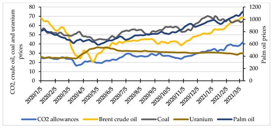CO2 allowances, crude oil, coal, uranium, and palm oil prices. Source: own elaboration on the basis of data from www.stooq.com (accessed on 19 April 2021).