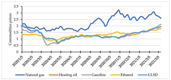 Natural gas, heating oil, gasoline, ethanol, and ULSD prices. Source: own elaboration on the basis of data from www.stooq.com (accessed on 19 April 2021).