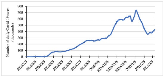 Daily COVID-19 cases. Source: own elaboration on the basis of data from https://ourworldindata.org/covid-cases (accessed on 19 April 2021).