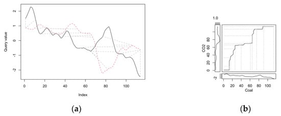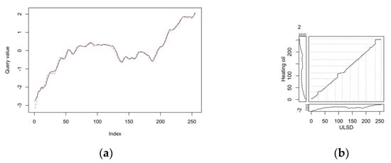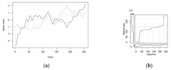 Let and be two time series. In the first step, in order to make meaningful comparisons between two time series, both must be normalised. In the case of time series, a standard method of processing raw data is z-normalisation. The need for time series normalisation is often emphasised in classification methods with the dynamic time warping and other distance measures [,].