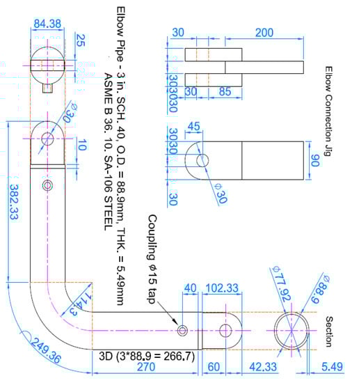 ASME/ANSI 3-inch standard piping was used to minimize the manufacturing errors and material uncertainty. A straight pipe of sufficient length of three times (270 mm) or more in diameter was attached to the elbow by welding to allow plastic behavior in the pipe elbow. As shown in Figure 1 and Figure 2, it was processed to implement a pin connection at both ends of the specimen and combined with a universal testing machine UTM (Universal Testing Machine).
