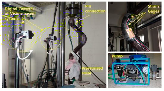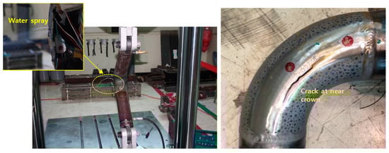 The repeated displacement test for a constant amplitude was performed on the elbow element, as shown in Table 1. A pressure of 3 MPa was applied to all samples, and a repeated force was applied for displacements of ±20 mm to ±100 mm, so sufficient nonlinear behaviors could be captured until leakage occurred. The weakest point of the pipe was the crown and the center of the elbow. A previous study reported that the strain in the hoop direction has a significant effect on damage [2]. Therefore, the strain in the crown region was measured using a strain gauge and a vision-based system based on image signal processing. In this study, the fracture mode of the pipe is defined as a leak caused by cracking. A repeated force test was performed until cracking occurred. Figure 3 shows the composition of the piping element test, including the crack and leak in the pipe elbow. Table 2 lists the results of repeated force experiments in which cracking occurred.