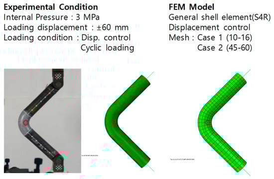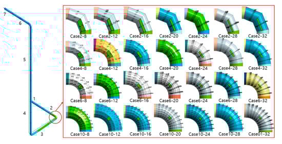 The piping system was modeled as a shell to examine the changes in the stress and strain of the pipe according to the change in mesh size. Such a numerical model was verified by a comparison with the test results in Section 2.2. The weak part of the piping is the elbow part. Therefore, the number of elements in the longitudinal and circumferential directions of the shell elements of the pipe elbow was adjusted. As shown in Figure 10, numerical analysis was performed by dividing the length direction and circumferential direction from 2 to 10 elements and 8 to 32 elements, respectively. All conditions except the number of elements for a pipe elbow were applied in the same way to check only the change in the stress and strain of the pipe according to the number of meshes (mesh size).