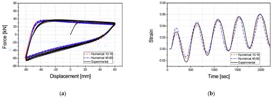 Comparison of the experimental and finite element analysis results: (a) comparison of the force–displacement response; (b) comparison of the strain response.