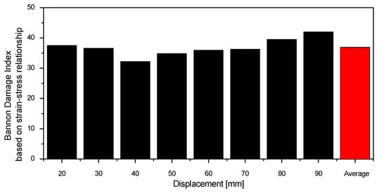 Cracks in the pipe elbow occurred on the inner surface of the crown and grew axially. Hoop strain was dominant. Hence, the hoop strain was used to define the failure of the pipe elbow. The numerical analysis model of the piping was constructed using shell elements. The mesh size was composed of 10–16 elements and 45–60 elements in the longitudinal and circumferential directions, respectively, and analysis was conducted under the same conditions as the test. Figure 5 compares the response of the ±60 mm test case. In the case of the force–displacement relation, the analysis results and test results showed good agreement. The damage index was calculated using Equation (1) from finite element analysis, and the average of the damage index was 35.25, as shown in Figure 6.