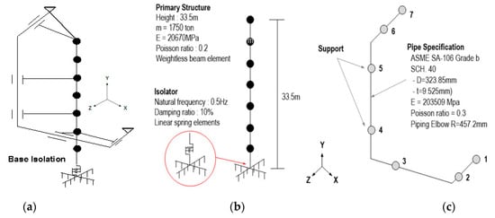 Seismic response analysis was performed on piping installed in the containment building to which the seismic isolation system had been applied. The NRC-BNL benchmark model [18] was used for the pipe model, and an isolator was applied to the lower part of the containment structure. The containment structure and piping were connected, as shown in Figure 7. Table 3 shows the boundary conditions for isolated containment structures and piping systems. The seismic isolation device was assumed to behave linearly, and the natural frequency of the isolated structures was designed to be 0.5 Hz. Carbon steel of ASME (B36.10 M, SA106, Grade b, SCH 40) was used, and the material properties are shown in Table 4 [21]. The outer diameter of the pipe was 323.85 mm, the thickness was 9.525 mm, and the radius of the curved pipe was 457.2 mm. The damping ratio was assumed to be 4% (Rayleigh damping), referring to the damping ratio of the SSE (Safe Shutdown Earthquake)-based piping systems in Regulatory Guide 1.61 [22]. The responses of the structure and piping were derived by performing seismic response analysis unidirectionally (Z-axis).