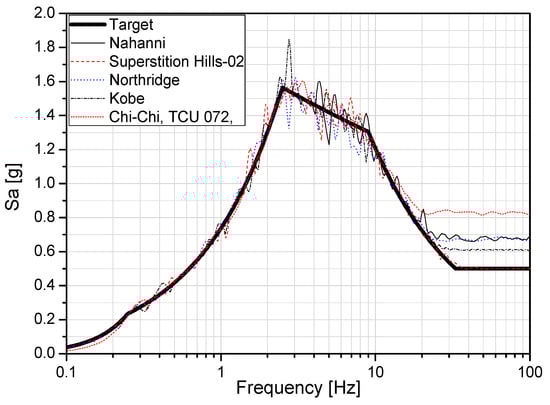 The five earthquake input motions that satisfy the requirements of ASCE 43-05 and the response spectrum of Regulatory Guide 1.60 were generated [23]. Figure 8 shows the target response spectrum for the horizontal unidirectional direction (Z direction) and the response spectrum for the generated input earthquake. Table 5 lists the information on the seed earthquake.