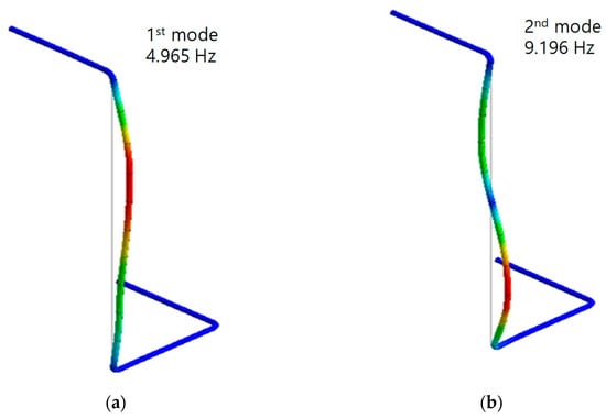 The design stress intensity value was 110 MPa, and the internal pressure was 6.31 MPa, and were applied to the pipe system, referring to the Boiler & Pressure code. Figure 9 presents the natural frequency and mode shape of the piping. The natural frequencies of the primary and secondary modes were 4.965 Hz and 9.196 Hz, respectively.