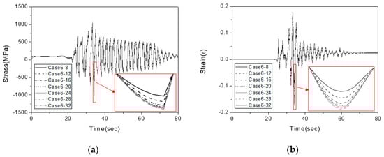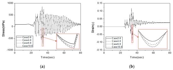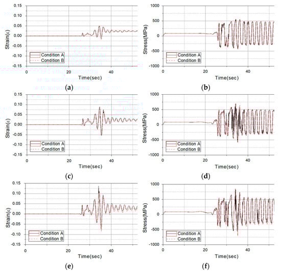 Comparison of the convergence “condition A” and convergence “condition B” analysis results (Northridge earthquake): (a) comparison of the stress (PGA level: 1 g); (b) comparison of the strain (PGA level: 1 g); (c) comparison of the stress (PGA level: 2 g); (d) comparison of the strain (PGA level: 2 g); (e) comparison of the stress (PGA level: 3 g); (f) comparison of the strain (PGA level: 3 g).