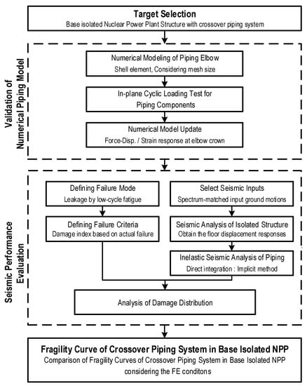 Specifically, seismic fragility analysis of the piping system for an isolated nuclear power plant was performed. Seismic fragility analysis of the piping system connecting the isolated and non-isolated parts was performed by modifying the NRC (U.S. Nuclear Regulatory Commission)-BNL (Brookhaven National Laboratory) benchmark model [18,19]. The justification of seismic fragility analysis of crossover-piping was confirmed by applying a damage index based on the dissipation energy to express the actual failure quantitatively [20].