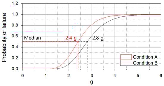 The seismic fragility curve of the piping was checked by varying the five input earthquakes and PGA levels (1 g, 2 g, and 3 g). The damage index was 35.25, which was calculated in Section 2. The seismic fragility curve was represented by a lognormal distribution, which confirmed a difference between the results of convergence “condition A” and “condition B”, as shown in Figure 15. Therefore, when deriving the seismic performance of piping through numerical analysis, differences occur in the results depending on the convergence conditions. The median value of the seismic fragility curve under convergence “condition A” and “condition B” was 2.8 g and 2.4 g, respectively, showing a difference of 0.4 g. Therefore, in this study, the seismic performance of the pipe was overestimated when the iteration is small for convergence.