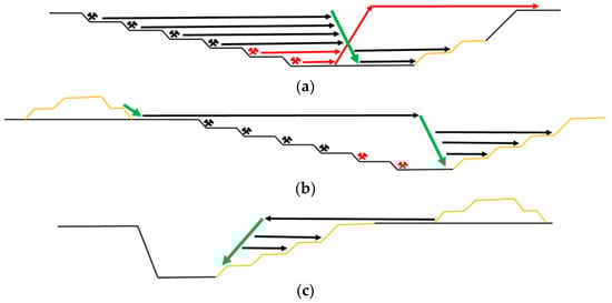 A schematic section through a continuous surface mine with various arrangements of overburden removal enabling the recovery of potential gravitational energy (red, black, green arrows–coal, overburden horizontal, overburden declined conveyors, respectively; yellow profile lines–dump sites, crossed hammers–exploitation levels); (a) Removing overburden volumes from mining levels to an in-pit dumping levels, (b) Translocation of overburden volumes previously temporarily dumped on a foreground to the final in-pit dumping levels, (c) partially liquidation of an external dump for the needs of reclamation earthworks of a post-mining void (shallowing and slopes forming)