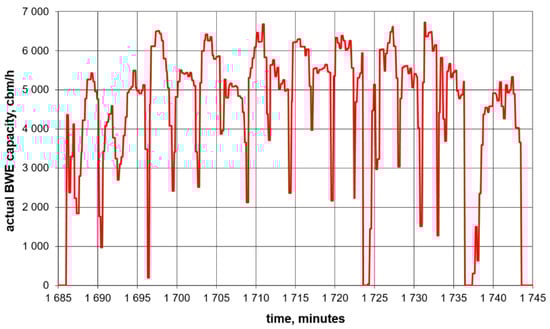 Assume that the collective overburden conveyor (length 565 m, average downward slope angle −7.2°) is fed on three successive overburden levels (marked A, B, C from the top; each mining level is 20 m high, the head station is positioned 70 m down from the top A level) by horizontal conveyors loaded with overburden directly from bucket-wheel excavator class KWK 1500 with a nominal capacity of 4200 cbm/h (see Figure 5). A, B, C excavators work for long periods with stable performance, according to the current disposition. The conveyor works 2000 h a year. Each excavator removes annually some 4 million cubic meters of overburden, which is transported to this conveyor. Excavators can work in different systems: all (but with limited capacity), two of three (with different levels of performance), or one of three. The actual working mode of the excavators and the actual capacity are not random as they are controlled from the mine control room by a shift dispatcher. Unlike the quality parameters driven by control of selective lignite mining in the case of mining the overburden benches, the dispatcher is obliged to follow the daily overburden removal schedule and maintain the overall energy efficiency of machinery and transportation equipment.