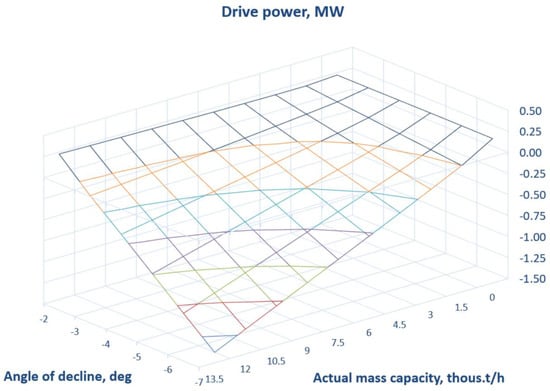 The area of positive power (conveyor is driven) shown in Figure 3 above the level of 0 MW indicated that the conveyor with an angle of inclination downward up to −3° is not suitable for energy recovery. Larger angles of the route inclination downward (from −4° to −7°) allow energy recuperation in a sufficiently wide performance range, assuming that the actual conveyor capacity exceeds 10% of the maximum one. The graph above shows the isolines of calculated power values for the stabilized transported overburden stream, which is typical for overburden removal (see Figure 2). However, for uneven streams, the resistance to motion increased (up to 10% [20]), which decreased the amount of recuperated energy. In addition, any maintenance failures (e.g., worn idlers, belt mistracking) or low ambient temperature cause an increase in the respective components of motion resistances. These factors will also reduce the capability of energy recovery.