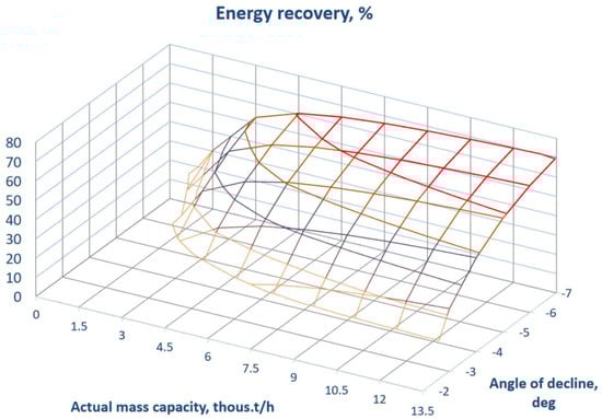 In Figure 4, only the area of the energy recovery rate exceeding 10% is mapped. Such a map can be used for scheduling the overburden removal in order to keep the actual conveyor capacity within the area of a high energy recovery rate.