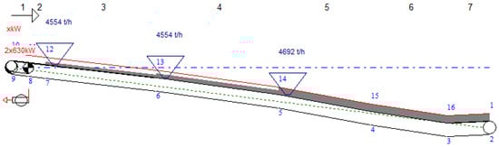 In order to determine the area of possible energy recuperation with the overburden conveyor, simulation calculations of motion resistances with the necessary drive power for route variants after a fall with a moderate slope of 2 to 7 degrees were performed. A route length of about 600 m was adopted, suitable for a conveyor working on a transportation ramp (see Figure 1). In the calculations, the specialized QNK-TT software for calculating belt conveyors’ motion resistances and drive power demand was used. Unlike the simplified standard algorithms, the QNK-TT software uses the more accurate method of calculating individual components of the main resistances to motion [17,19]. This is done on the basis of the theoretical analysis of the energy dissipation processes in a conveyor belt and the material load stream, and the analysis of the interaction between the belt and idlers. The investigations were validated against the numerous laboratory and industrial tests [22,23] and eventually resulted in verified algorithms for calculating motion resistances. In the QNK-TT program, a large set of data of a belt, transported bulk material, and the design characteristics of a conveyor, as well as its specific operating conditions, are used, and calculation results allow analyzing the impact of selected parameters on the belt conveyor drive power requirement.