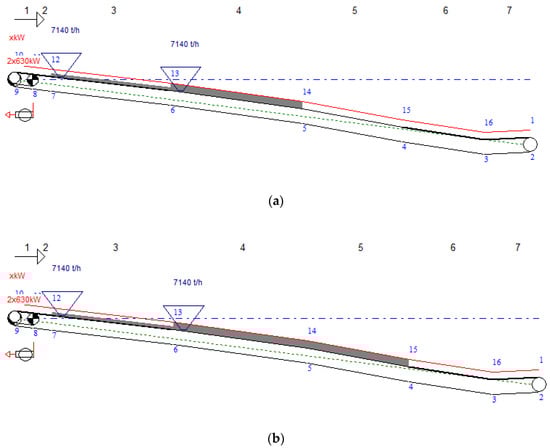 The profile of the study route of the overburden conveyor, loaded on two subsequent mining levels and being alternatively discharged on its route: (a) 1 mining level below the second loading point, (b) 2 mining levels below the second loading point (source: QNK-TT).