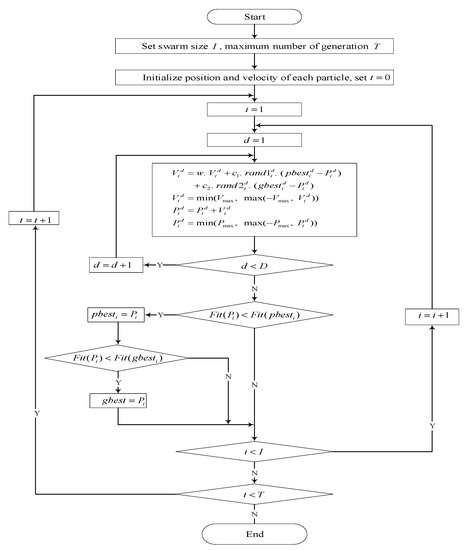 Additionally, the velocities and positions of all the particles are constrained to the interval and by the relationships and . The flowchart of the PSO algorithm is given in Figure 1.