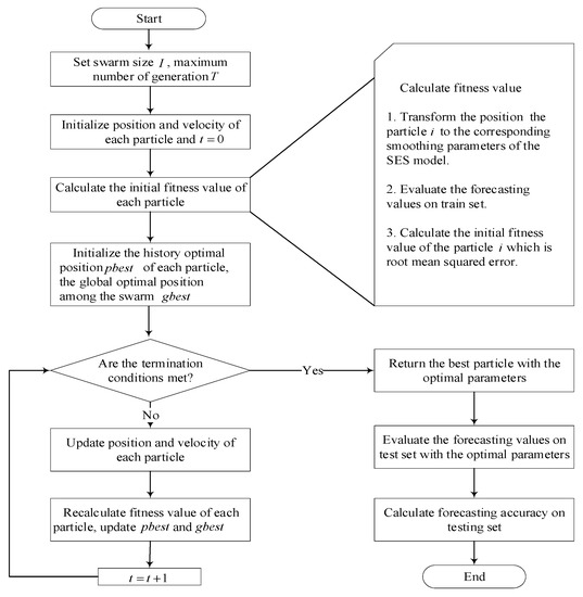 The SES methods are simple and accurate forecasting models, but their performance depends to a great extent on the values of smoothing parameters. Some studies have attempted to find the values of smoothing parameters, such as maximum likelihood estimates [22,23,24], trial-and-error procedures [25], and grid search [26]. However, these parameter optimization methods have certain limitations; for maximum likelihood estimation, its application premise is that each sample in the sample set is an independent and identically distributed random variable, which is usually difficult to achieve in the real world. The disadvantage of the trial-and-error method is that it cannot ensure that the optimal or near-optimal parameters will be found. Although the grid search approach, as a simple and effective parameter optimization method, is widely used, it should be noted that its computational complexity increases exponentially with the number of parameters and the width of the grid. Therefore, an effective and efficient smoothing parameter optimization approach that is able to find the global optimal or near-optimal solution with the fastest speed is very much needed. Motivated by the fact that the PSO algorithm has been widely used for parameter tuning of artificial intelligence techniques in energy forecasting [27,28,29,30], and the advantages of its simple concept, easy implementation, and quick convergence [31,32], this present study proposes a model integrating the PSO algorithm with SES models for accurate medium-term electricity consumption forecasting.