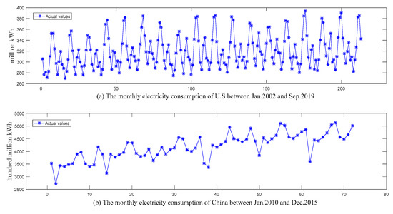 - model selection: the trial-and-error method based on BIC was used to determine the order of the model. In this paper, the models established for the two electricity consumption datasets in U.S. and China were and , respectively, and all the estimated parameters in these two models passed the significance test;