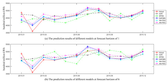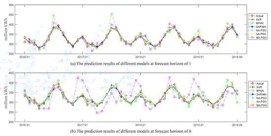 Figure 4 and Figure 5, respectively, show the comparison of actual values and predicted values for all the examined models (i.e., NA-PSO, AA-PSO, MA-PSO, SARIMA, SVR, and BPNN) in the U.S. and China datasets. And the subgraphs (a) and (b) in these two figures show the predicted values of all the examined models at the forecast horizons of 1 and 6, respectively. The prediction performances of the above models in terms of two accuracy measures (i.e., MAPE and NRMSE) are shown in Table 3. Here, “NA” denotes the SES model without a trend term but with an additive seasonal term, “AA” denotes the SES model with an additive trend term and additive seasonal term, and “MA” denotes the SES model with a multiplicative trend term and an additive seasonal term, and PSO was used to optimize the smoothing parameters of these SES models.