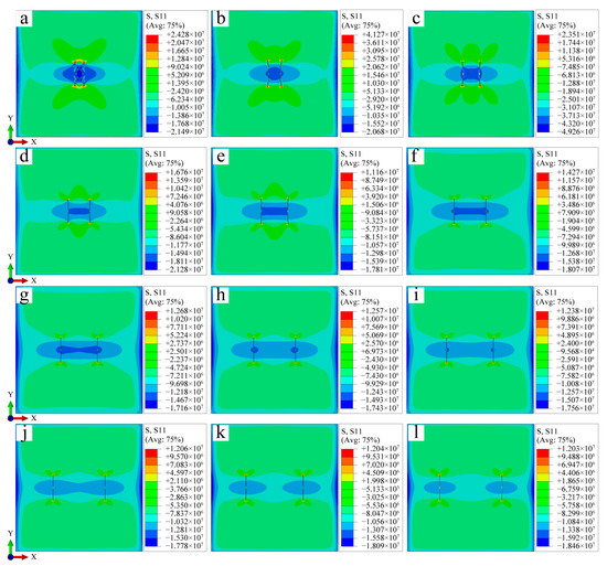 Horizontal stress contours with different perforation spacing at injection time of 10 s. There is a concentrated zone of compressive stress between the two perforations, which decreases with the increase in perforation spacing. (a–l) represents perforation spacing from 2 m–24 m, respectively.