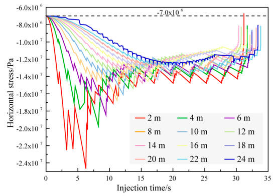 According to Figure 3, it can be found that the middle of the two perforations is a stress shadow zone. Therefore, detecting the stress variation in the middle of the two perforations can intuitively indicate the change process of stress shadows. Hence, the horizontal S11 stress of the two perforation center points was extracted, and the process of stress variation at the point throughout the whole fracturing process was observed, as shown in Figure 4. According to Figure 4, it can be found that the two perforation center points are in the state of compressive stress during the whole fracturing process. Before the beginning of fracturing, the compressive stress at the center point under different perforation spacing is 7 MPa, which is the initial ground stress. As the fracturing progresses, the compressive stress at the center point increases first and then decreases. That is to say, with the propagation of the fracture, the compressive stress between two perforations increases continuously until the hydraulic fracture extends to a certain length, and then the compressive stress begins to decrease. That is, the stress shadow effect begins to weaken, which indicates that the size of the stress shadow is affected by the fracture length. The size of the stress shadow changes with the propagation of hydraulic fractures.