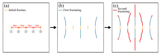 According to the fracturing design method proposed above, XFEM was used to verify it. Five initial fractures were arranged as perforations and numbered (Figure 9a). First fracturing ①③⑤, the first fracture path was obtained (Figure 9b). Under the effect of stress shadow, fractures ① and ⑤ expand backward, while fracture ③ expands along the direction of maximum principal stress. The middle of the fracture is always the unfractured zone. Therefore, after the completion of the first fracturing, the perforations ② and ④ can be re-fractured to obtain the fracture path after the second fracturing (Figure 9c). During the second fracturing, the hydraulic fracture path deflects under the influence of the pre-existing hydraulic fractures. Both fractures ② and ④ will deflect towards fracture ③, and eventually converge to form a fracture network. Meanwhile, the secondary fracturing can activate the primary fracturing silent fracture, so that the fracture of the first fracturing can be reactivated and expanded, further increasing the fracture distribution area. In addition, after the second fracturing, there is still an unfractured zone in the middle of the two perforations. Therefore, a new perforation can be inserted between the two perforations to perform multi-batch fracturing, although the number of fracturing processes in multi-batch fracturing needs to be studied further. This fracturing design scheme can effectively obtain a complex fracture network and improve the production rate.