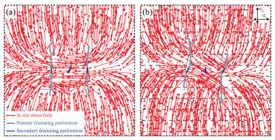 Many scholars have proved that the propagation of hydraulic fractures will change the distribution of in situ stress fields. Roussel et al. [3] discussed the range of the stress reversal zone and proposed that it was not suitable for re-perforation in this region, whereas the stress reversal caused by the stress shadow also has a positive effect. As shown in Figure 11a, the in situ stress field between the two fractures changed from vertical to horizontal after fracturing. Therefore, when refracturing between two perforations, the new perforation can be set to be angled with the existing perforation. Especially for layered rock masses, the maximum principal stress is perpendicular to the bedding plane (in the Barnett shale). It is generally believed that an angle of 30 degrees between perforation and maximum principal stress can obtain a better fracturing effect. The secondary in situ stress field between the perforations after fracturing is roughly orthogonal to the perforations (Figure 11b), so the parallel of the perforation angle and in situ stress field will have a better fracturing effect during the secondary fracturing. A multi-batch variable angle perforation fracturing method can be proposed according to the research results.