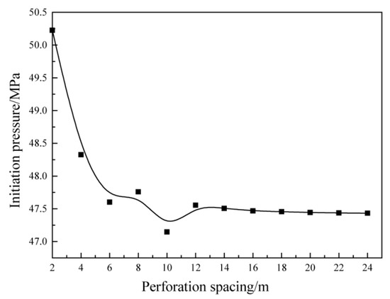 Fracture initiation pressure is an essential key parameter in the field fracturing construction [27], which has an important influence on the selection of construction equipment and the control of injection rate in hydraulic fracturing design [28]. Therefore, the study of fracture initiation pressure is crucial for oil and gas production. Existing studies show that fracture trace angle [29], port number [30], the pressurization rate [31] and viscosity of fracturing fluid [32] all affect fracture initiation pressure. However, there are few studies on the influence of perforation spacing on initiation pressure. Therefore, in this work, the initiation pressure was extracted, and the effect of different perforation spacing on reservoir initiation pressure was obtained (Figure 12). With the decrease in perforation spacing, the initiation pressure increases. Thus is because, when the perforation spacing is small, the fracture initiation must overcome both the in situ stress field and the secondary stress field induced by the stress shadow, which results in larger initiation pressure. Furthermore, when the perforation spacing increases to a particular value, the stress shadow decreases and the initiation mainly overcomes the in situ stress and tensile strength. Additionally, the in situ stress and strength parameters are fixed, so the initiation pressure no longer changes. However, it is interesting that the initiation pressure does not decrease monotonically with the perforation spacing. Before the perforation spacing reaches a certain fixed value, there is already a perforation spacing which can minimize the initiation pressure (the simulation results of this paper show that the minimum initiation pressure is found when the perforation spacing is 10 m). Therefore, if we can find the perforation spacing with the minimum fracturing pressure before the initiation pressure is constant. Then, under this perforation spacing, the expansion of two hydraulic fractures will be affected by the stress shadow, resulting in a backward expansion phenomenon, increasing the expansion area of the hydraulic fracture. Meanwhile, there is a small initiation pressure. This takes advantage of the positive effects of stress shadows.