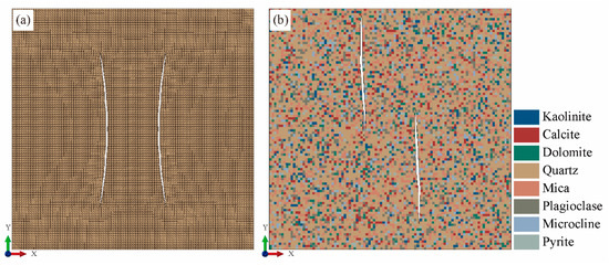 The heterogeneity of shale is not considered in this study. However, shale, as a sedimentary rock, is not only inhomogeneous in terms of mineral particles but also heterogeneous in terms of laminar structure [33]. Both affect the fracture propagation path [34,35,36]. Han et al. [21] proposed a method to create a mineral heterogeneity model. Using this model, we compared the effects of isotropy and mineral heterogeneity on fracture propagation paths (Figure 13). Mineral heterogeneity determines the initiation sequence of fractures and increases the roughness of fractures. Of course, more impact results need to be studied. Additionally, modeling methods for heterogeneous materials with complex microstructure can also be used [37].