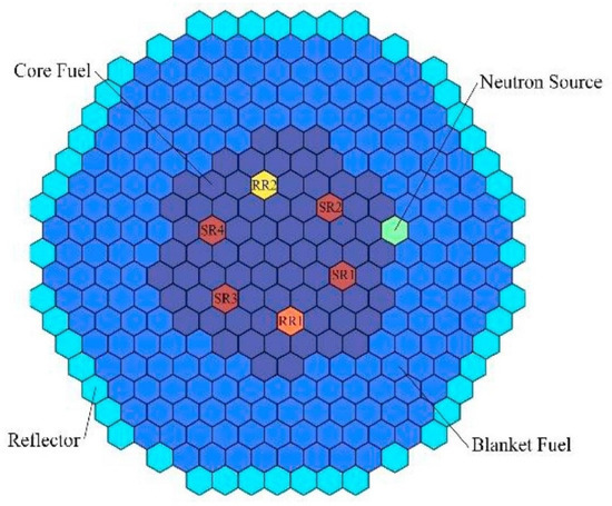 In the JOYO MK-I core, the six control rod assemblies were divided into two groups, regulating control rod (RR) and safety control rod (SR). These two groups and the radial position of each control rod assembly are shown in Figure 2. The control rod worth was obtained from two SARAX criticality calculations. The first one was obtained by full withdrawal of all six control rods, and the second one was obtained by full insertion of a specific control rod. The Equation (12) gives the definition of final control rod worth (CRW) results. The effective delayed neutron fraction was 521 pcm from benchmark report.