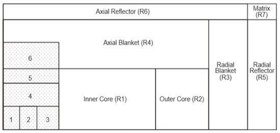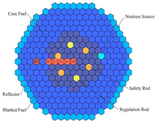 Figure 3 shows the position of voided assemblies during the measurement. In total, six assemblies were voided in the experiment. The labels of each voided assembly are [000], [1F1], [2F1], [3F1], [4F1], and [6F1]. Equation (13) was used to obtain the sodium void reactivity (SVR) value. Subscript 1 and 2 indicate the voided case and normal case. During the measurement, two RRs were inserted into the core and all the SRs were out of the core. The position of each control rod assembly is shown in Table 2.