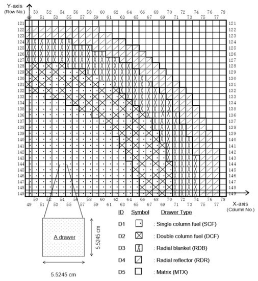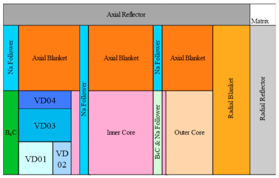 Unlike the JOYO MK-I core, the ZPPR cores were assembled from several types of small plates into stainless steel drawers, such as depleted uranium, Pu-U-Mo fuel, sodium, and stainless steel. In the calculation, the as-built drawers were simplified into one-dimensional plate-stretch models, as shown in Figure 6. In addition, the canned sodium plates in drawers in the affected zone were replaced by void cans during the sodium void reactivity experiment, and the affected zone contained at least 9 drawers for each case. Therefore, the special design and specific experiment of ZPPR made the neutron flux of core more anisotropic. Consequently, the control rod worth and sodium void reactivity experiment of two cores were calculated in the following sections.
