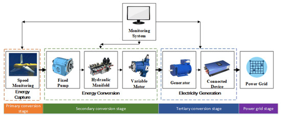 At present, the main technologies of sea current energy generation include permanent magnet synchronous generation [6], double-fed asynchronous generation [7], and hydraulic transmission and control generation. Among these technologies, permanent magnet synchronous generation and double-fed asynchronous generation are more mature and have been used in practice and hydraulic transmission is characterized by its flexible layout [8]. Hydraulic transmission control power generation is a relatively new field, but has been the subject of a gradual increase in attention and research interest in the field of new energy generation due to the unique advantages of the hydraulic system compared with other transmission systems. Wei Zhang obtained the optimal design scheme and regulation strategy to the hydraulic conversion system [9]. Zengguang Liu et al. employed a double closed-loop control scheme to meet the need for a constant motor speed regardless of the change in load power [10]. Figure 1 shows the power generation principle of a hydraulic transmission control power generation system. The system generates electricity by secondary energy conversion via the path of current energy–mechanical energy–hydraulic energy–mechanical energy–electrical energy. As a result, a synchronous generator outputs a constant frequency of electrical energy. Therefore, the operation state of the system determines the characteristics of the entire power generation system and affects the quality of the final power generation.