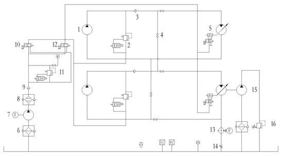 Hydraulic system schematic. 1—hydraulic pump, 2—relief valve, 3—check valve, 4—on/off valve, 5—hydraulic motor, 6—oil suction filter, 7—oil refill pump, 8—high-pressure filter, 9—oil fill check valve, 10—oil fill directional valve, 11—relief valve, 12—control directional valve, 13—cooler, 14—throttle valve, 15—loading pumps, and 16—loading relief valve.