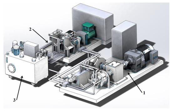 Figure 3 shows the overall structural composition of the hydraulic power generation system. The composition and layout of the entire system is shown more intuitively in Figure 3, where (1) is the pump source, also known as the simulated turbine area. It consists of a control cabinet, inverter motor, reducer, radial piston pump, and corresponding hydraulic valve. The numbers (2) and (3) represent the load simulation area and hydraulic station, respectively, consisting of a hydraulic motor, generator, system control cabinet, hydraulic oil tank, and the corresponding hydraulic valve.