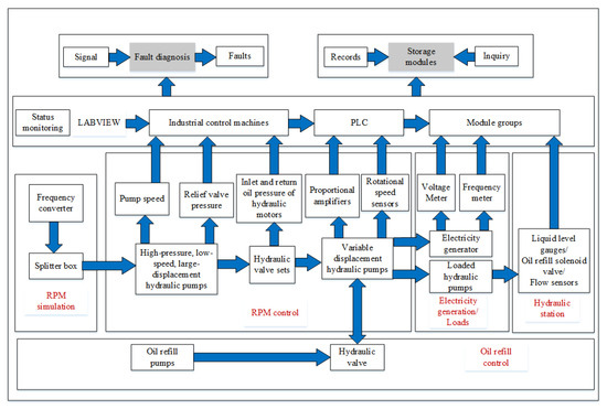 In addition, monitoring and diagnosis of hydraulic transmission and control power generation systems is conducted online. Cheng Gang Yang elaborated the theory analysis of active online test of hydraulic diagnosis technology [16]. Online monitoring and diagnosis can be used to monitor a system’s operation status in real time by observing the system’s core parameters, such as system pressure, motor speed, and temperature. However, online monitoring and diagnosis can be restricted in laboratories due to the high requirements of the working environment due to leakages in the hydraulic pump station and pipeline, which cause pollution, installation accidents, noise, and other problems. Shen Yin compared the basic data-driven methods for process monitoring and fault diagnosis (PM–FD) [17]. Gaowei Xu introduced a simple but effective online fault diagnosis method to convert measured sensor signals to fault images [18]. Therefore, investigations have been undertaken of remote monitoring and diagnosis technology, which can avoid shortcomings such as the operation noise of the hydraulic pump station, without affecting the operating characteristics of the hydraulic transmission and power generation system.