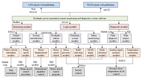 The remote monitoring software and fault diagnosis model were combined to reduce the influence of environmental factors. This also allows operators to control the system at all times from any location, to realize the integration of the monitoring and diagnosis of hydraulic transmission and power generation system. The six main functional modules of the software can be further subdivided into the detailed design of functions and submodules, thus providing the foundation for the subsequent implementation of the software by combining the requirements of the software and the functional division.