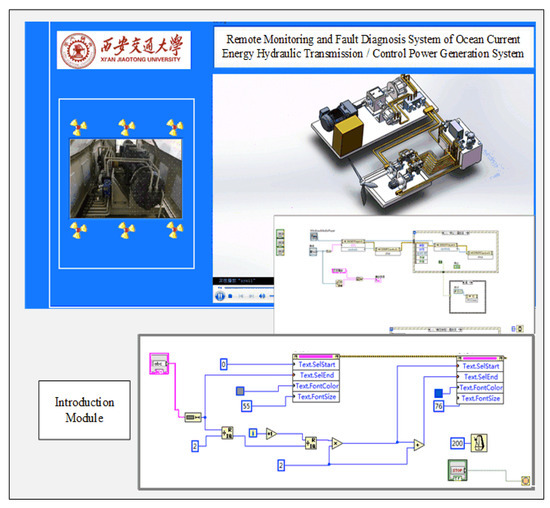 In accordance with the design requirements of the hydraulic transmission and control power generation monitoring and diagnosis system, the monitoring content of the entire system can be divided into the parameter setting module, data display, and storage module, operation and operation module, and fault diagnosis module. An introduction interface was added to show the actual situation, in addition to a 3D simulation model to provide a more attractive and complete system. Thus, the user is able to gain a preliminary impression of the entire system. The introduction interface is shown in Figure 7.