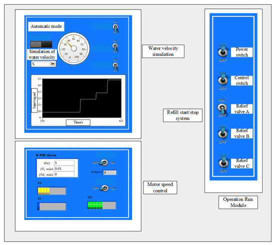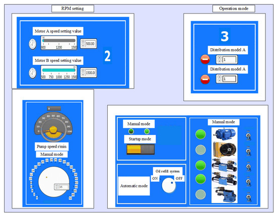 The parameter setting module is shown in Figure 8. The selection of operation mode is designed according to the actual situation, and has manual and automatic operation modes. The two modes are unable to be used simultaneously, and the manual mode cannot be used after the automatic mode is turned on. The hydraulic transmission and control power generation system was designed as a distributed structure, with one motor connected to the generator and another motor connected to the fixed pump. In addition, the corresponding system mode can be selected according to different commissioning situations. The pump speed setting value is changed by the frequency setting value of the inverter.