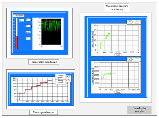 The temperature of the hydraulic oil is usually controlled between 30 and 50 °C. Maximum and minimum temperatures are set for the hydraulic oil, and the system sounds an alarm when the system temperature is higher than the maximum and lower than the minimum temperature. The motor output speed, motor set speed, pump speed, system flow rate, and motor outlet pressure are shown in Figure 10.