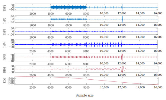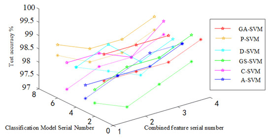 Figure 16 shows feature signals extracted from the noise of non-linear and non-smooth processes. The first six components are selected based on the correlation coefficients and the permutation values are obtained, and the permutation feature vectors of the 6-dimensional components are constructed. Figure 17 shows tests after dimensionality reduction by principal component analysis and before treatment. Analyzed from the perspective of combination features, the model test accuracy of combination feature 4 is the highest, and the model test accuracy corresponding to combination features 1, 2, and 3 will be lower. From the perspective of classification models, classification model number 7, which is the support vector machine model optimized by the PSVM in this paper, has the highest test accuracy, 99.4%.